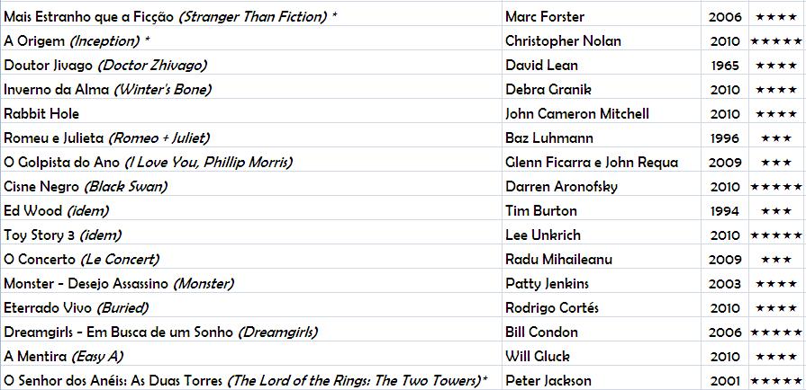 No cinema, acertei as também mamatas: "A Rede Social", filme drama; "Minhas Mães e Meu Pai" filme comédia/musical; Fincher, melhor diretor; Firth e Portman, atores em drama; Bening atriz comédia/musical; Sorkin em roteiro e "Toy Story 3" em animação.